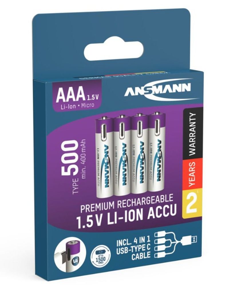 Ansmann 4-pak genopladeligt AAA-batteri Li-ion 500mAh med USB-C