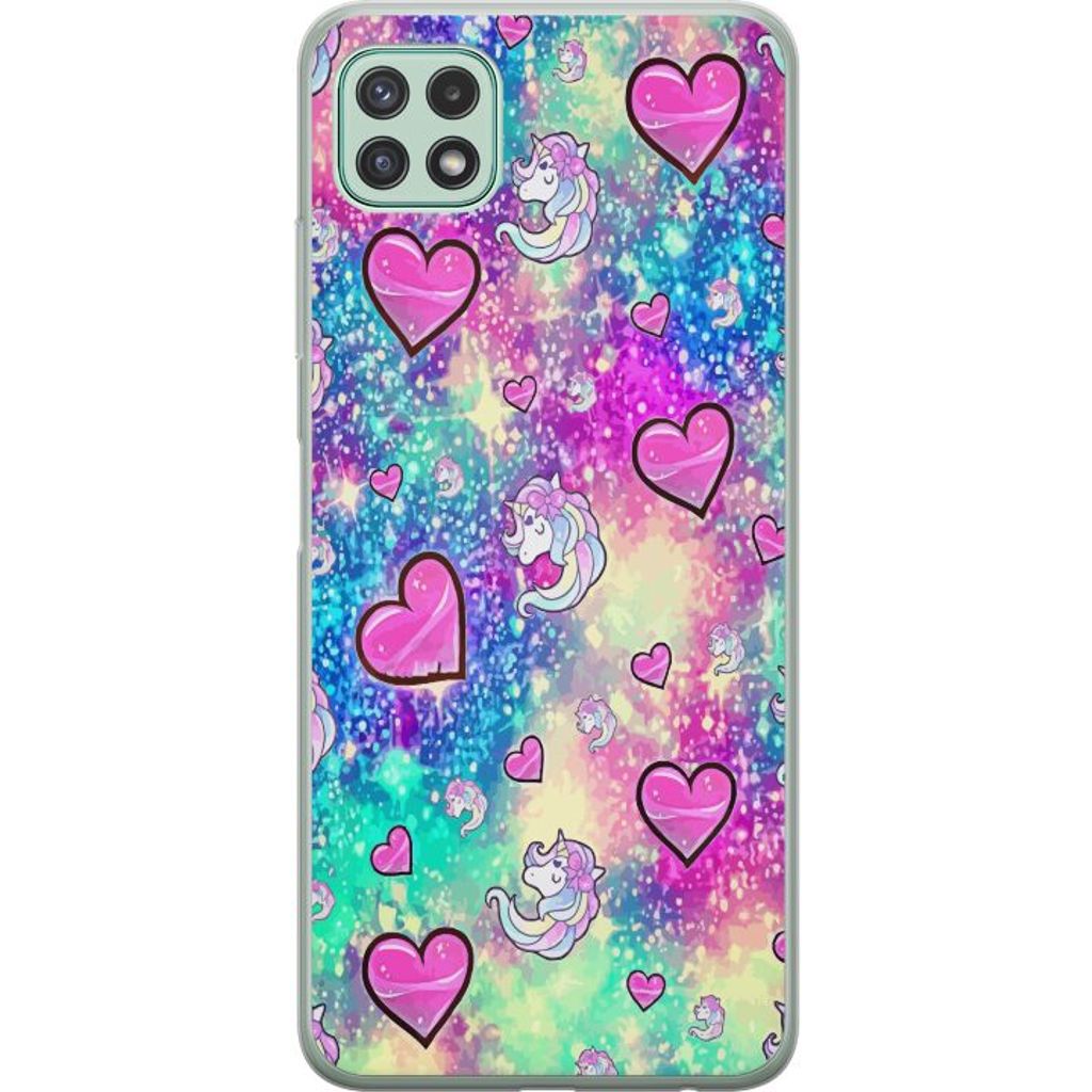 Samsung Galaxy A22 5G Gennemsigtigt Telefoncover Enhörning och hjärtan